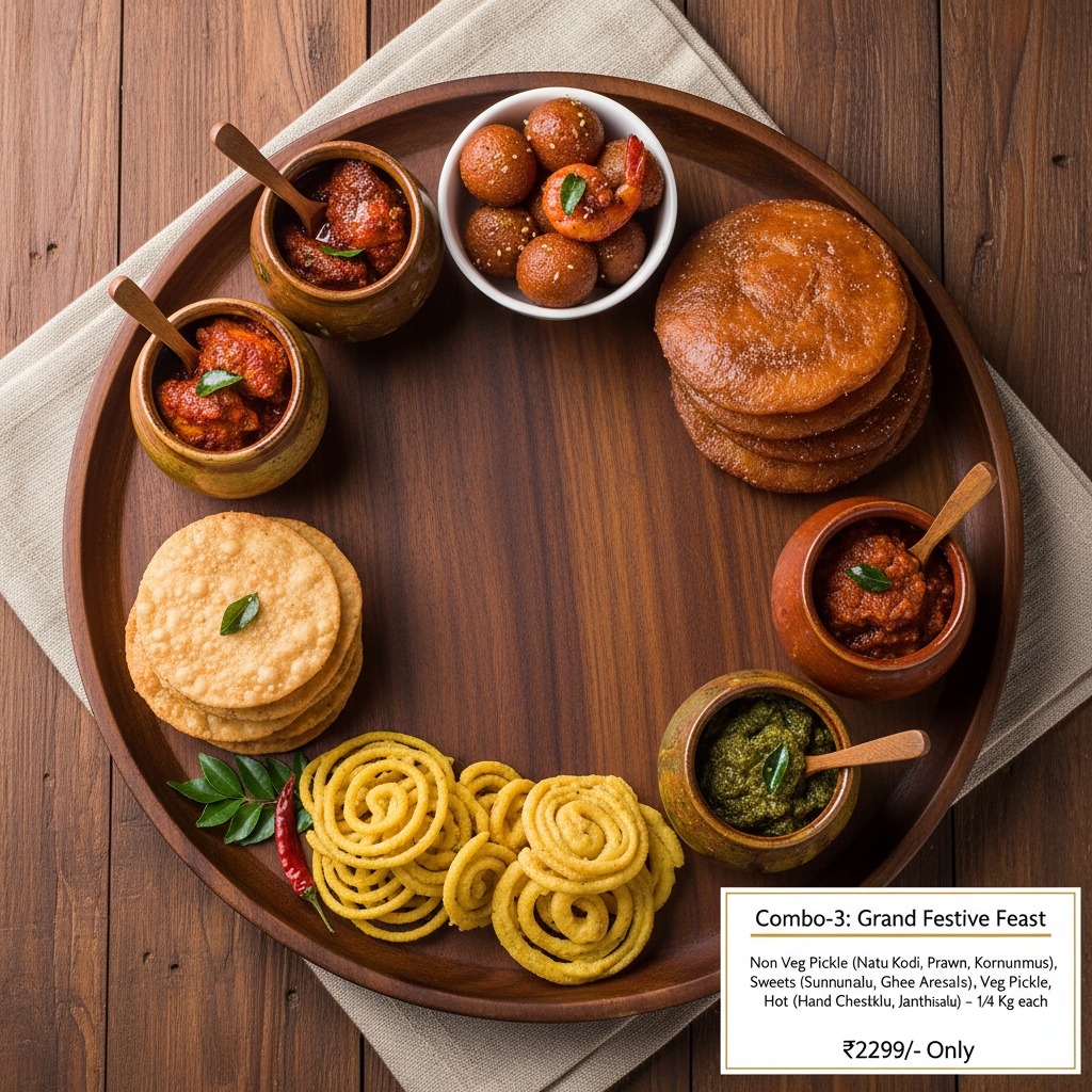 Non Veg Pickle (Natu Kodi, Prawn, Korameenu), Sweets (Sunnundalu, Ghee Aresalu), Veg Pickle (Allam, Gongura, Tomato), Hot (Hand Chekkalu, Janthikalu)